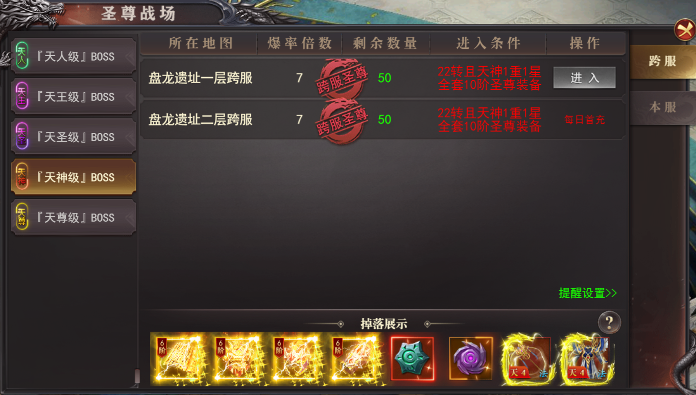(1)达到对应圣尊装备穿戴等阶方可进入 (2)掉落圣尊高阶装备