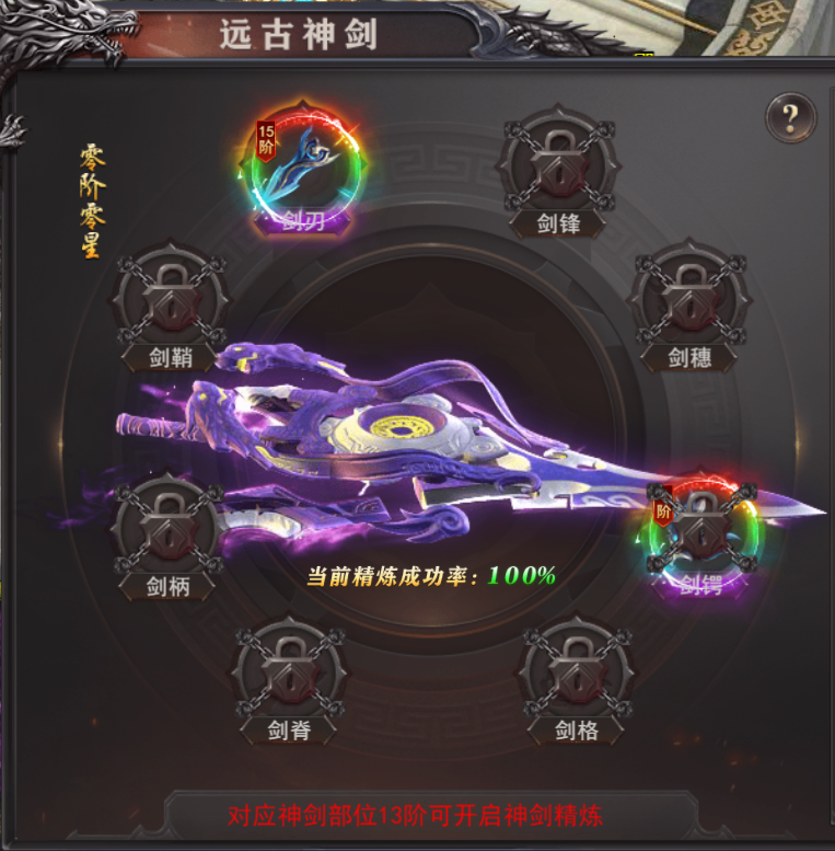 (2)对应神剑部位13阶可开启神剑精炼