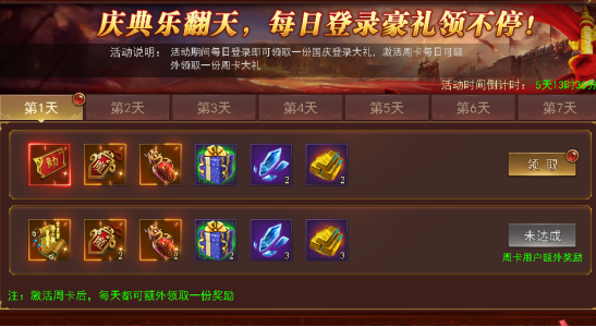 活动期间每日登陆领取大量奖励,周卡会员双倍领取,国庆期间更有助手激活道具,快速完成日常任务
