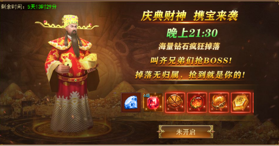 活动期间每日21:30刷新庆典财神,财神掉落各种稀有奖励