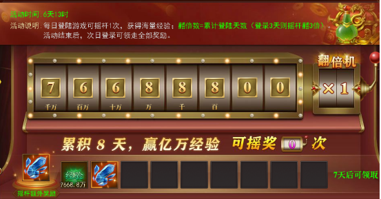 活动期间每日可抽取一次经验,抽取随机1至5倍,每次抽取必定获得一个高级奖励,每日获得奖励全部计入奖池,8号可一次性全部领取,还可以花费钻石双倍领取