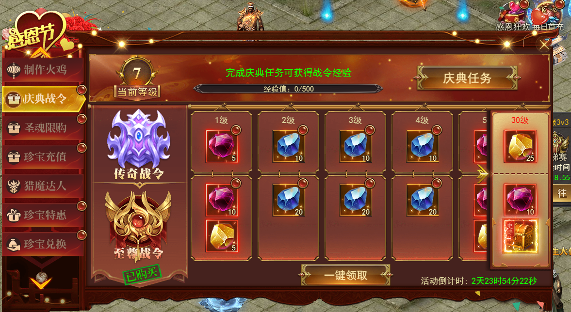 活动期间开放传奇战令,简单完成战令庆典任务,可免费获得大量奖励,可以充值开启至尊战令,激活至尊战令每个等级额外获得一份奖励,更有史诗剑甲