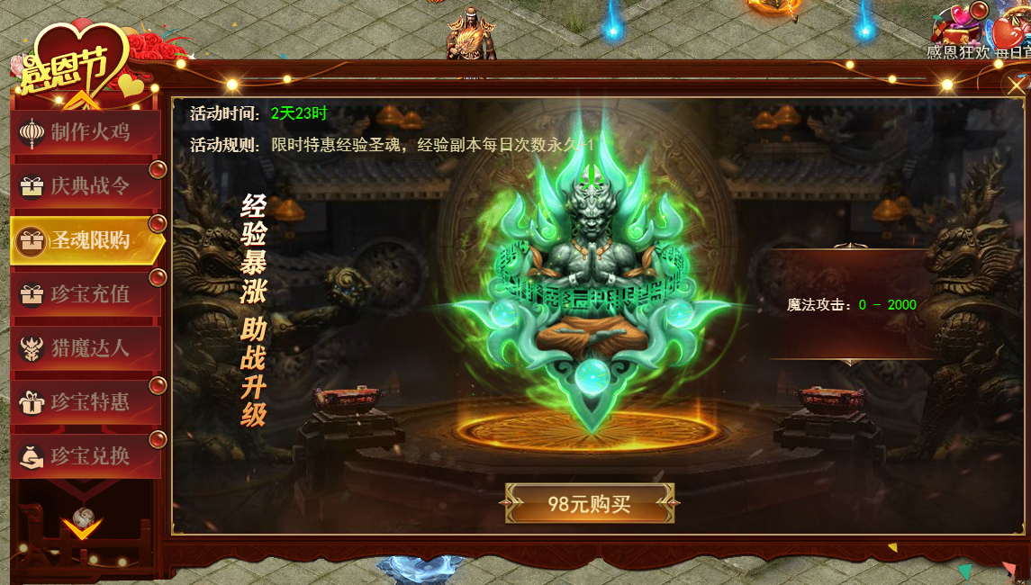 活动期间开启圣魂直购活动,购买可获得经验圣魂,圣魂激活后获得攻击加成,更可获得永久增加每日经验副本次数等特权。