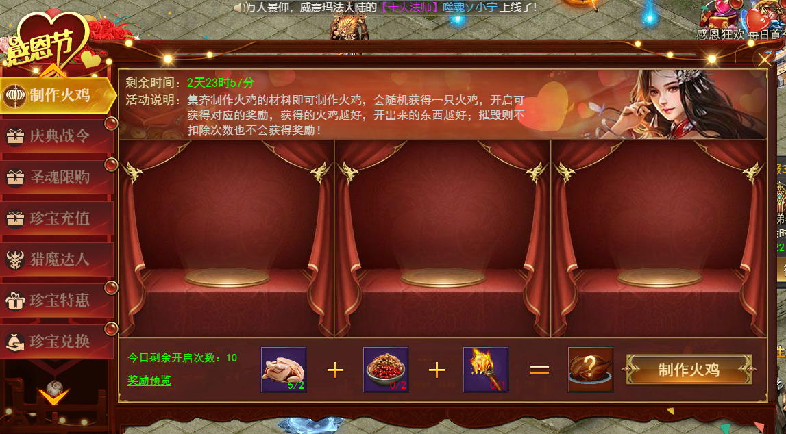 集齐制作火鸡的材料即可制作火鸡,会随机获得一只火鸡,开启获得对应奖励,获得火鸡越好,开出的道具越好。(火鸡材料在活动期间野外、BOSS有掉落)