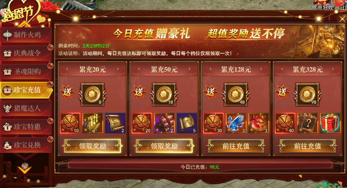 活动期间,每日充值达标可领取奖励,每日每个档位仅限领取一次!