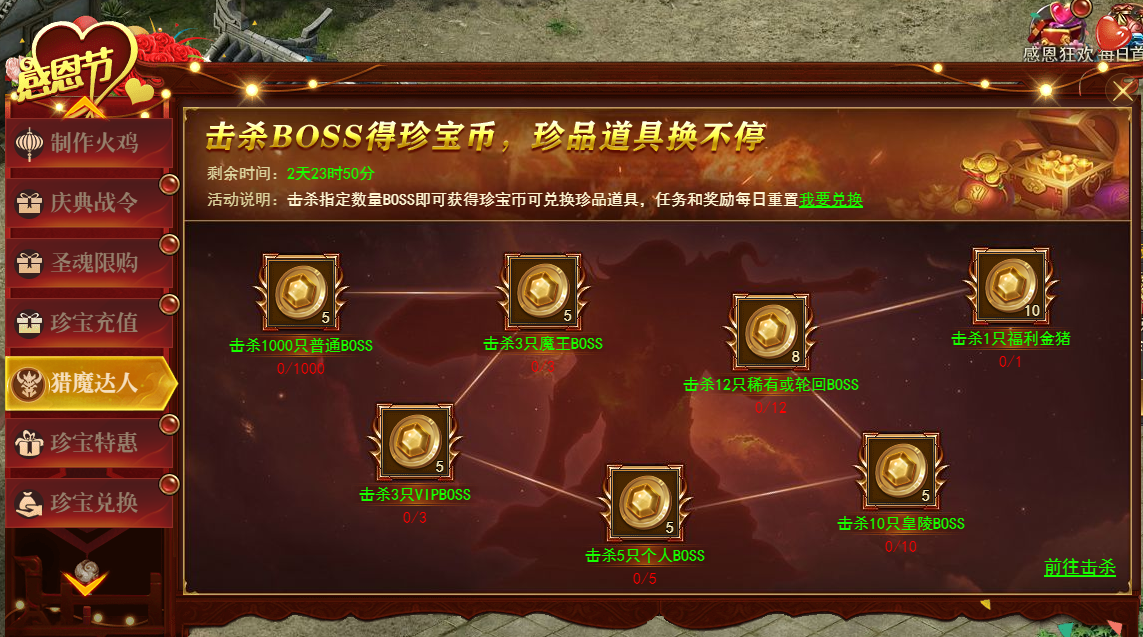活动期间击杀指定数量BOSS即可获得珍宝币可兑换珍品道具,任务和奖励每日重置。
