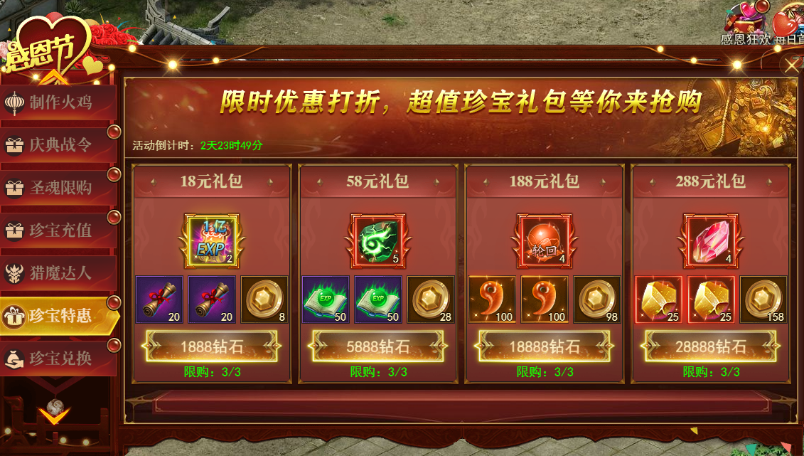 活动期间开启超值礼包限时优惠打折,每种礼包限购3次