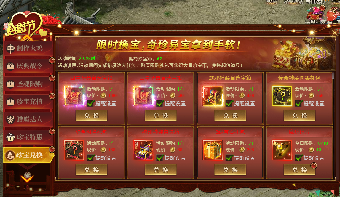 活动期间完成猎魔达人任务、购买限购礼包可获得大量珍宝币,兑换超值道具!