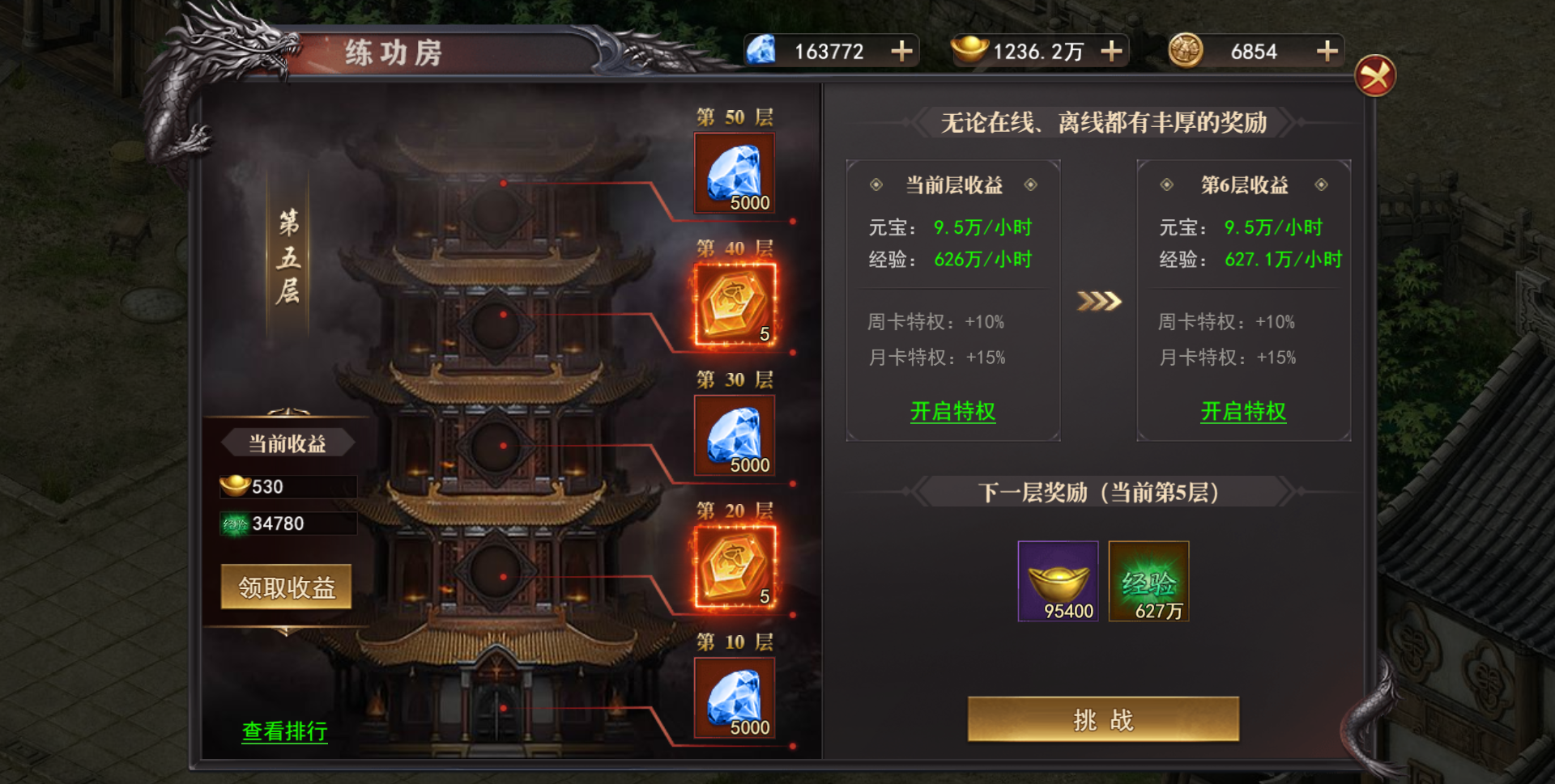 玩法开启后,玩家可随着时间获得大量的挂机奖励。通过层数越高,单位时间内获得的挂机收益越高!
