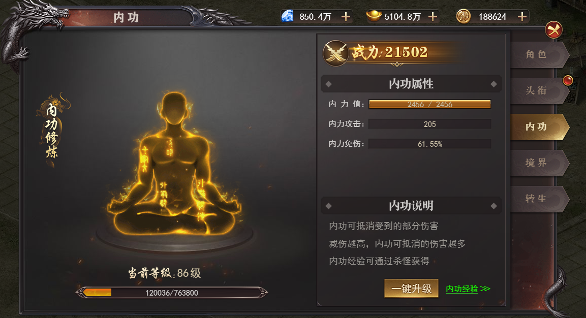 提升内功等级需要消耗内功经验,可以通过打怪获得