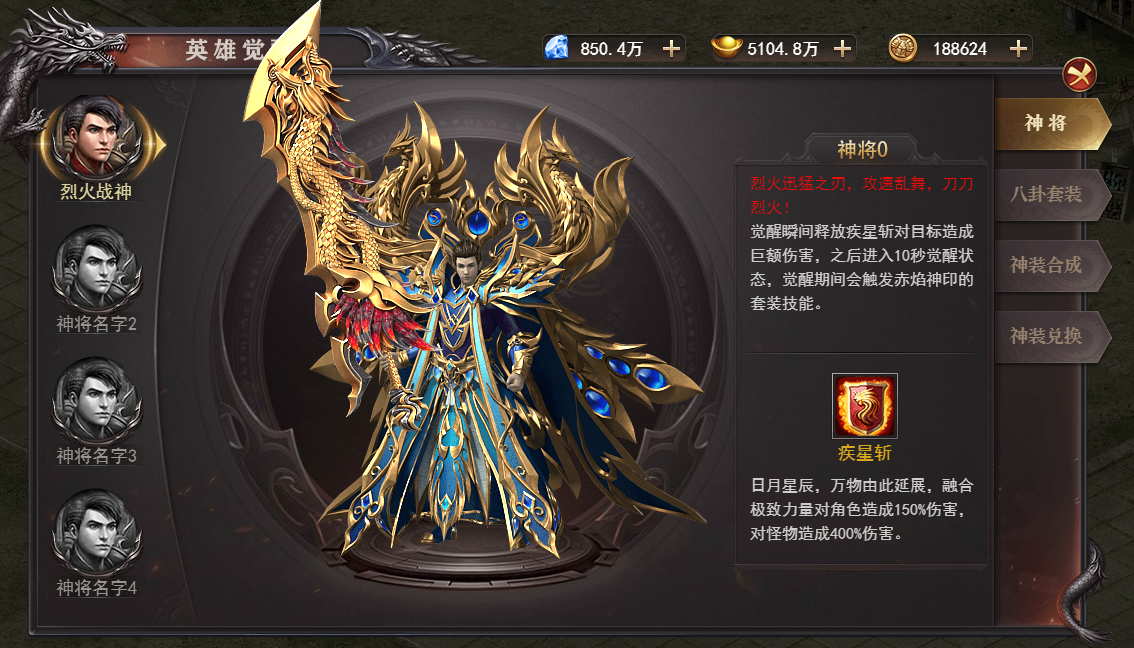 神将可穿戴八卦及神装套装,可提升大幅提升神将技能的伤害