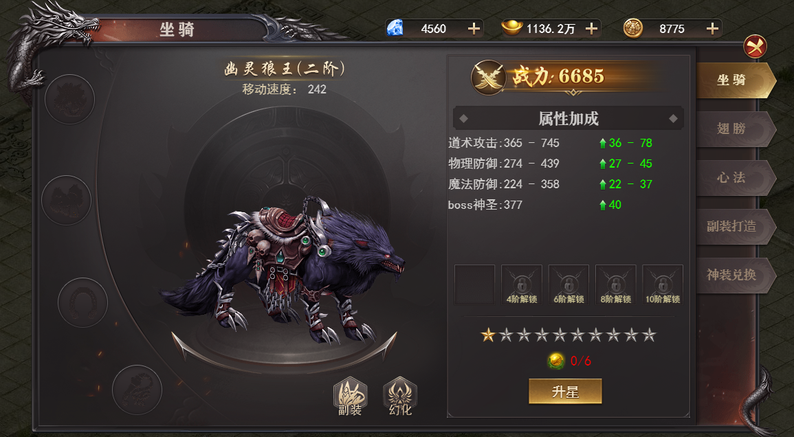 坐骑可以通过升星改变坐骑的外观形象,还可提升移动速度,并且大幅提升角色属性