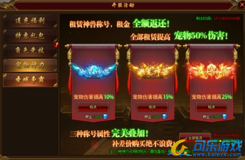活动内容:活动期间,租赁宠物神力可以大幅提升宠物伤害,活动结束后花费的钻石会全额返还。