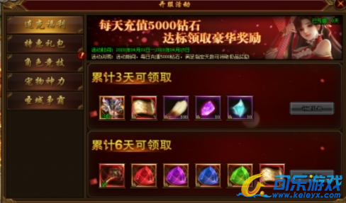 活动内容:活动期间,每日充值5000钻石,满足指定天数即可领取极品奖励!