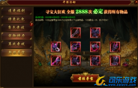 活动内容:新服寻宝狂欢,开服第5-6天,每天全服前2888次寻宝必定获得超多奖励!
