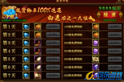 活动内容:活动期间可以花费9888钻石进行投资,登录7天即可拿回全部钻石还能额外获得巨额奖励!
