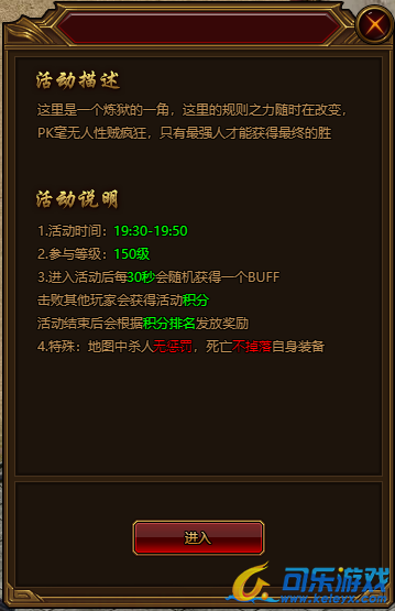 活动开始后,玩家在地图当中可随意PK,活动地图中会随机刷新:易伤、减少技能CD、增加超高额攻击力等随机事件。