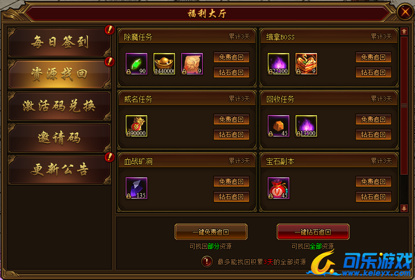 最多可以找回前3天未完成的基础活动和任务的奖励,有两种找回方式,分别是免费召回部分以及钻石全部找回!