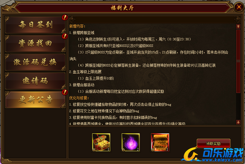 可以查看最新一次游戏更新的内容,并领取停服跟新的补偿!