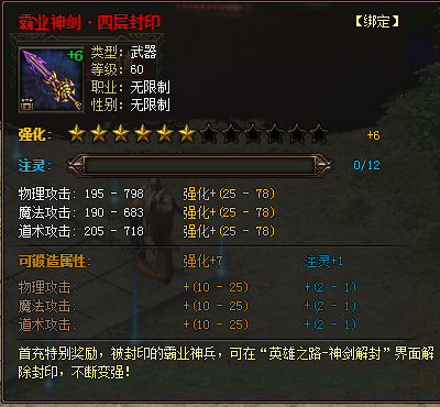 初始霸业神剑是60级装备并且强化+6,提供高额的属性加成的同时,也有大幅提升属性的潜力以及可锻造属性。
