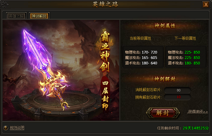 玩家在英雄之路的神剑解封项目下,可以依次消耗相应的解封石碎片进行对霸业神剑的解封,解封动作会大幅提升武器的属性。最终成为极其强大的武器。