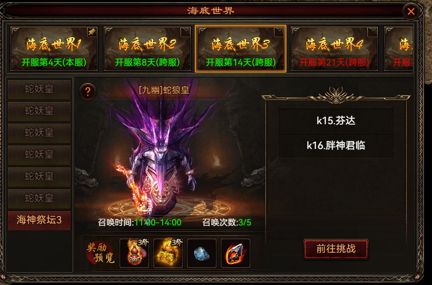 四圣封神是一款传世元神极致攻速的传奇游戏,独特的三元神,酷炫的技能特效,合击神技秒杀boss,海底世界地图开服第四天开启,活动为全天开放,并且根据开服天数转变为跨服活动,周四、周五跨服选城期间,跨服断开,跨服入口会关闭,海底世界会掉落首领召唤令和法宝、龙鳞石以及大量奖励,首领召唤令只可在每天11.00-11.30对应的海底世界中进行召唤,boss奖励会更高且掉落为公共拾取,多余的法宝可以分解成材料,用于升级法宝等级。