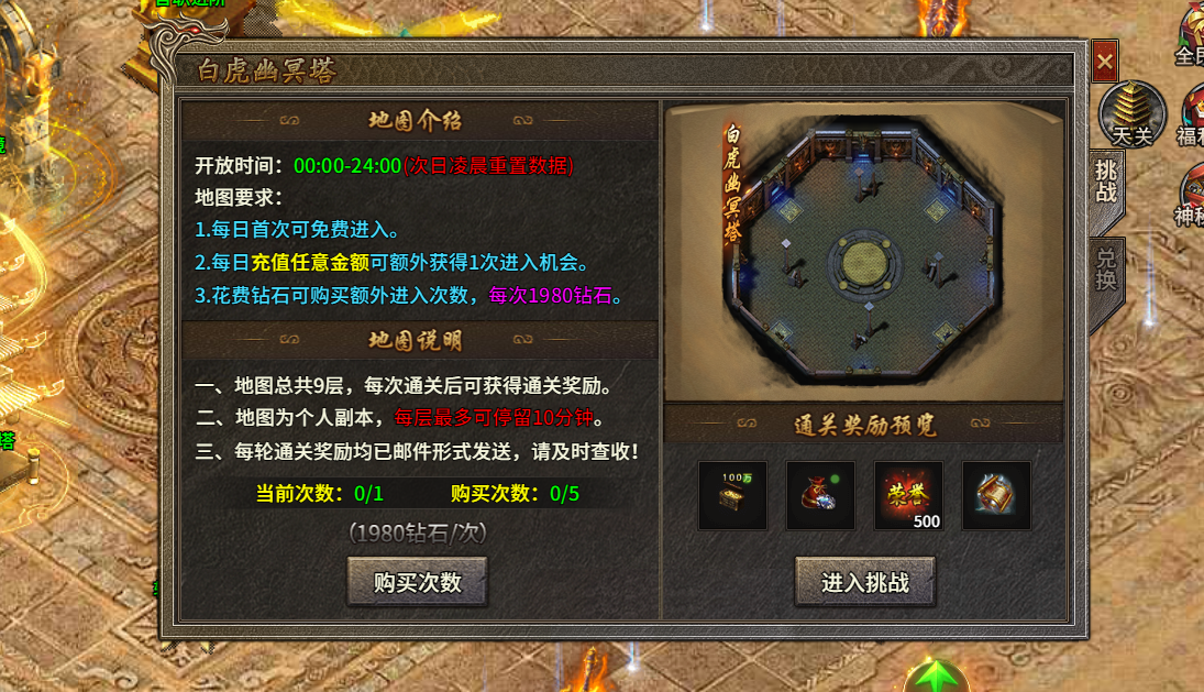 地图要求,每日首次可免费进入,每日充值任意金额可额外获得一次进入机会,花费钻石可购买额外进入次数。每次1980钻石。