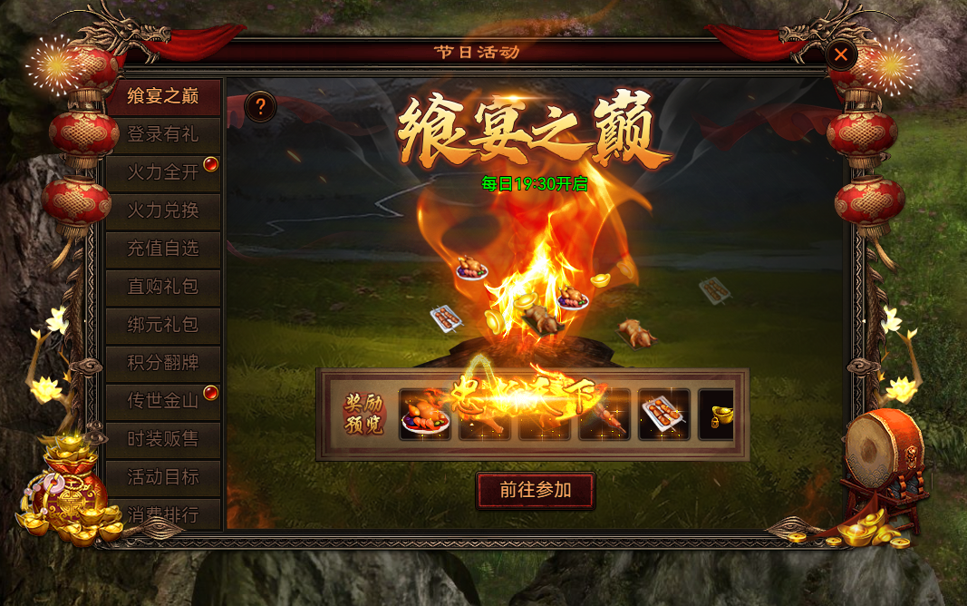 四圣封神是一款传世元神极致攻速的传奇游戏,独特的三元神,酷炫的技能特效,合击神技秒杀boss,四圣封神盛世狂欢活动每个月月底开启,活动持续7天,飨宴之巅每日19.30开启,可以获得时效性的增强道具和元宝,每日登录都可以领取奖励,火力全开可以充值可以获得彩炮,彩炮击中烟花可以获得节日彩卷,节日彩卷可以兑换道具,充值有礼充值达到金额可以选择一个奖励领取,每档奖励限领一次,直购礼包绑元礼包可以根据自己需求购买对应道具奖励,积分翻牌可以获得翻牌对应奖励,传世金山可以抽取诛仙装备,抽取达到一定次数可以领取次数奖励,时装贩售可以一键购买多件时装,消费排行消费元宝达标可以上榜,前9可以获得排行奖励,未获得前9可以获得参与奖。