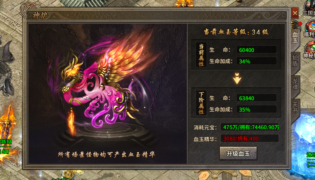 2. 血玉升级需要血玉精华,升级之后可以升级生命、生命加成、护盾升级需要护盾精华、升级之后增加防御,龙魂升级需要龙魂精华,升级之后增加攻击属性,天书升级需要天书精华升级之后增加暴击属性。