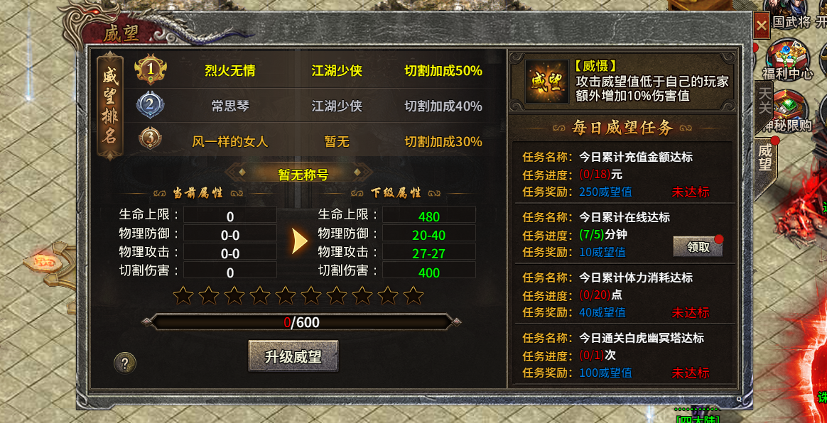 2.威望值用途,累计获得威望值达标升级所需威望值时饥即可升级威望星级并获得属性加成及威望称号,累计获得威望值排名前三玩家更有拥有切割加成属性加持。