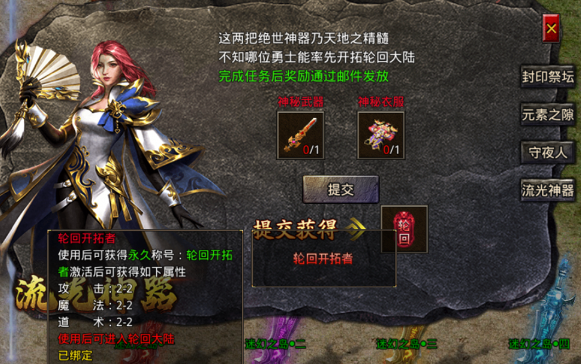 任务奖励:提交成功后永久获得【轮回开括者】称号,使用后可以进入轮回大陆。
