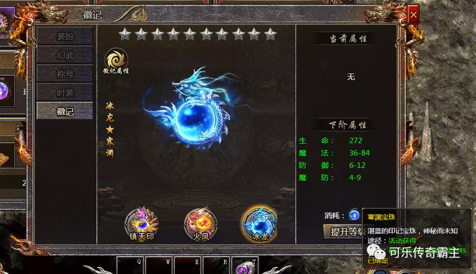 玩家要使用寒渊宝珠,需进入到装扮里的徽记界面,去消耗寒渊宝珠,来提升冰龙★寒渊徽记等级。大家提升冰龙★寒渊的等级,可以获得更多的生命、攻击/魔法/道术、防御、魔防的属性加成哦。