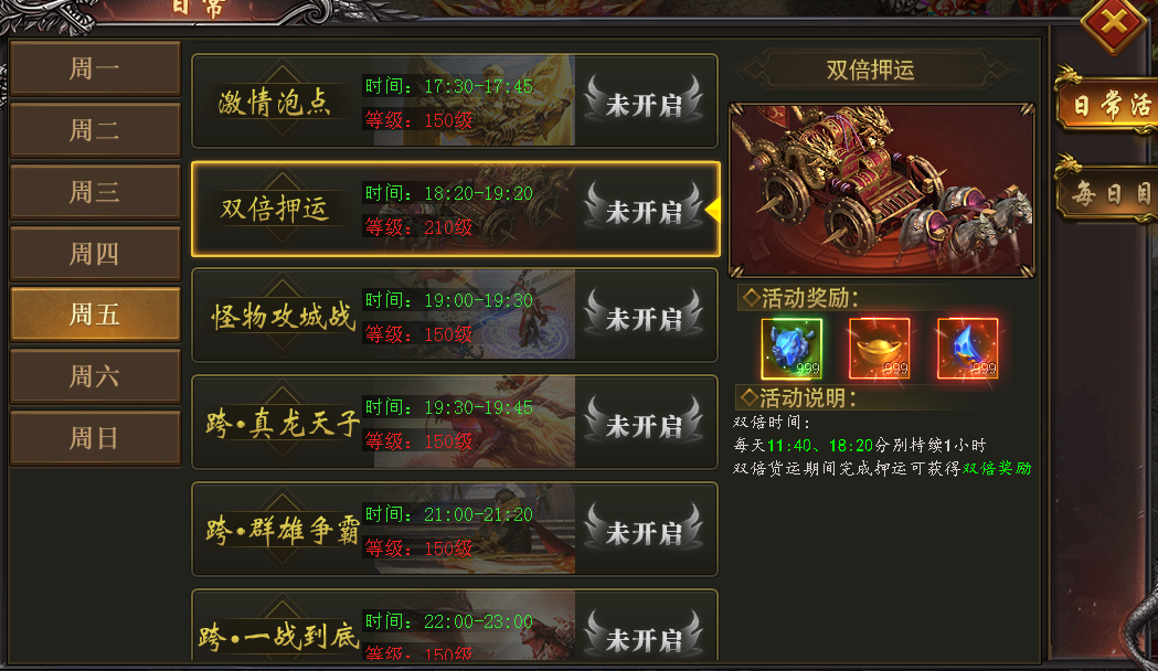 活动说明:角色210级以上可参与活动,期间完成押运任务可获得双倍奖励。