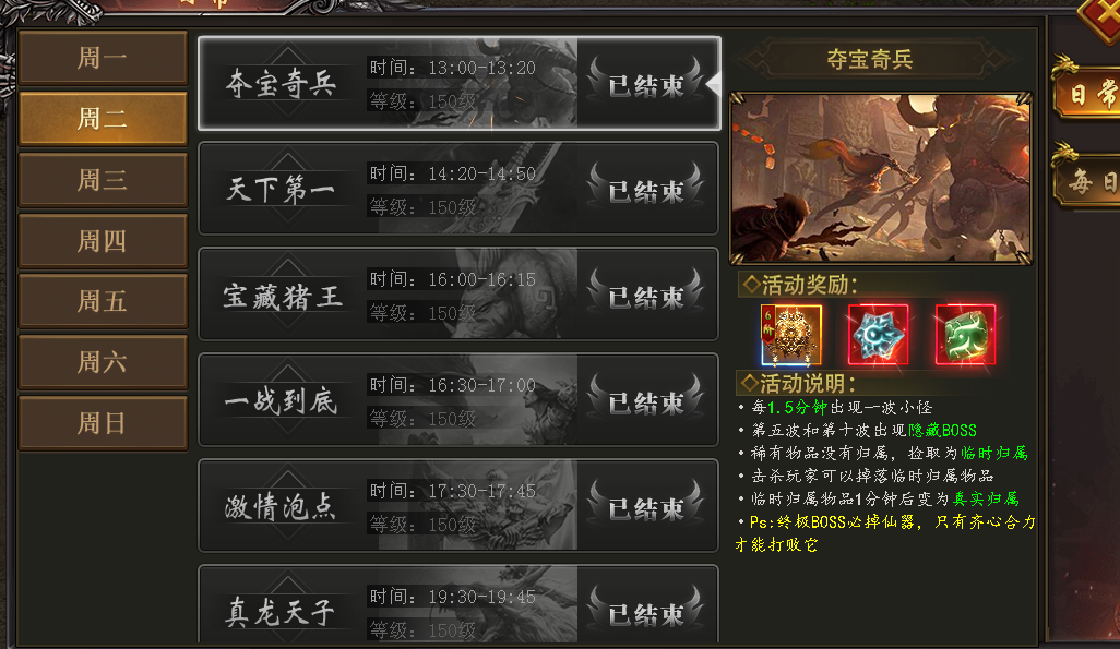 活动说明:角色150级以上可参与,前往夺宝圣地参与活动,每90秒出现一波小怪,第5、10波怪物出现隐藏BOSS,捡拾的物品为零时归属,拥有1分钟后变为真实归属。