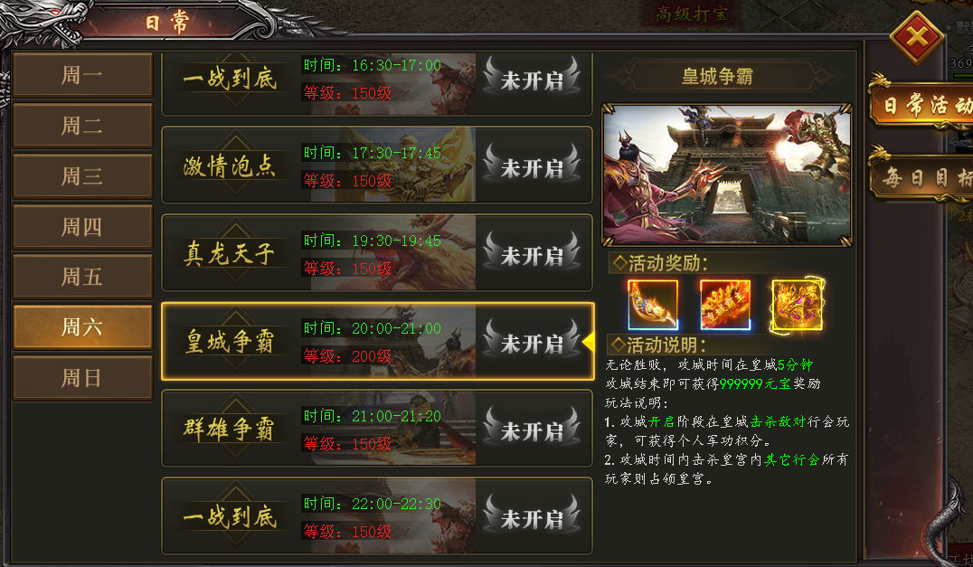 活动说明:角色200级以上可参与,前往皇城击杀敌对玩家可获得个人军功,攻城时间击杀皇宫内其它行会所有玩家则占领皇宫。