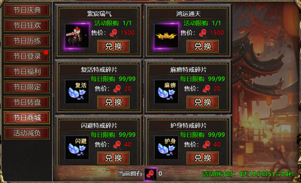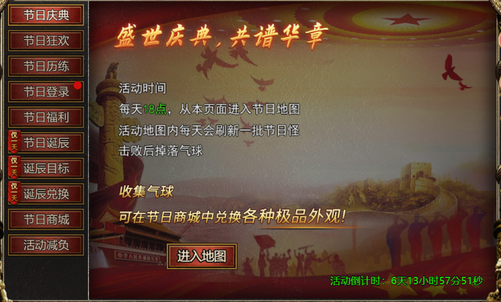 【活动内容】:每天18点可进入节日地图,打节日怪,掉气球,换极品外观!