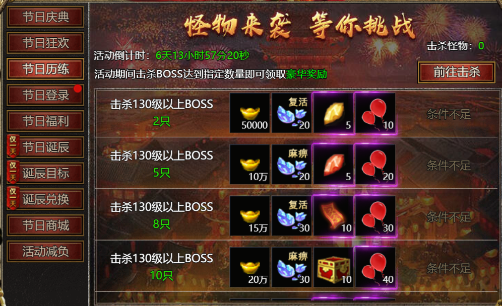 【活动内容】:活动期间,击杀怪物达到指定数量,领取奖励!