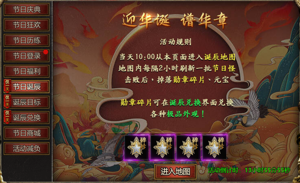 【活动内容】:10月1日当天10点开始,进入诞辰地图击败节日怪,收集勋章碎片可在诞辰兑换中兑换活动外观!