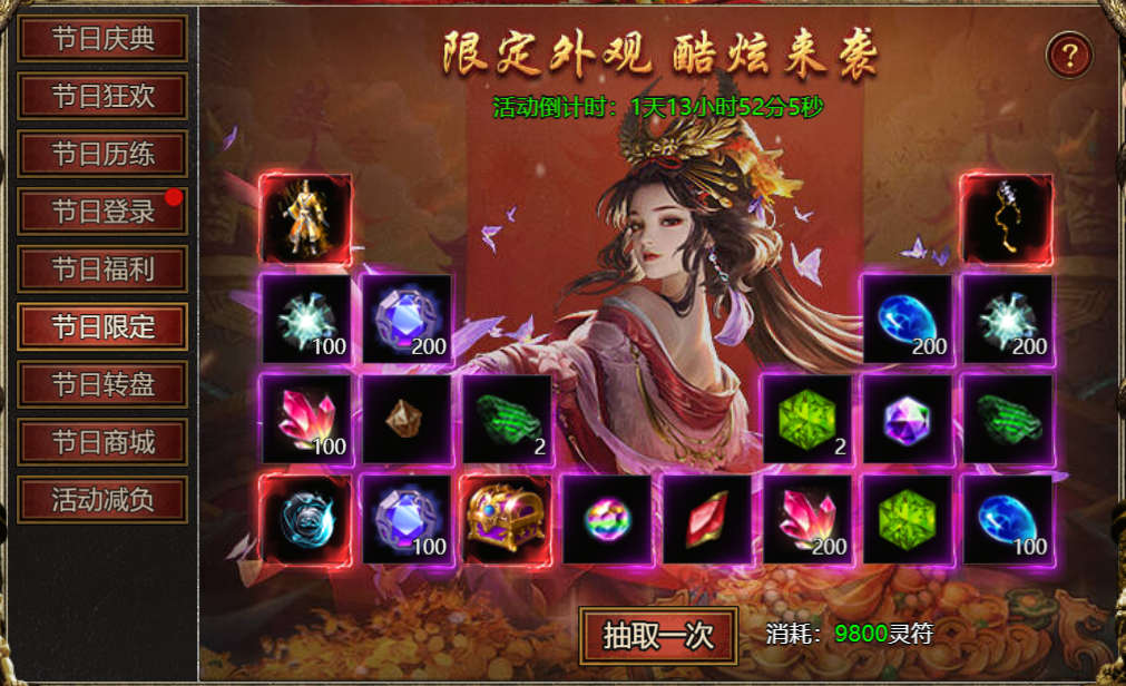 【活动内容】:活动期间,使用灵符购买限定碎片并进行抽取奖励,抽满奖励全部获得。