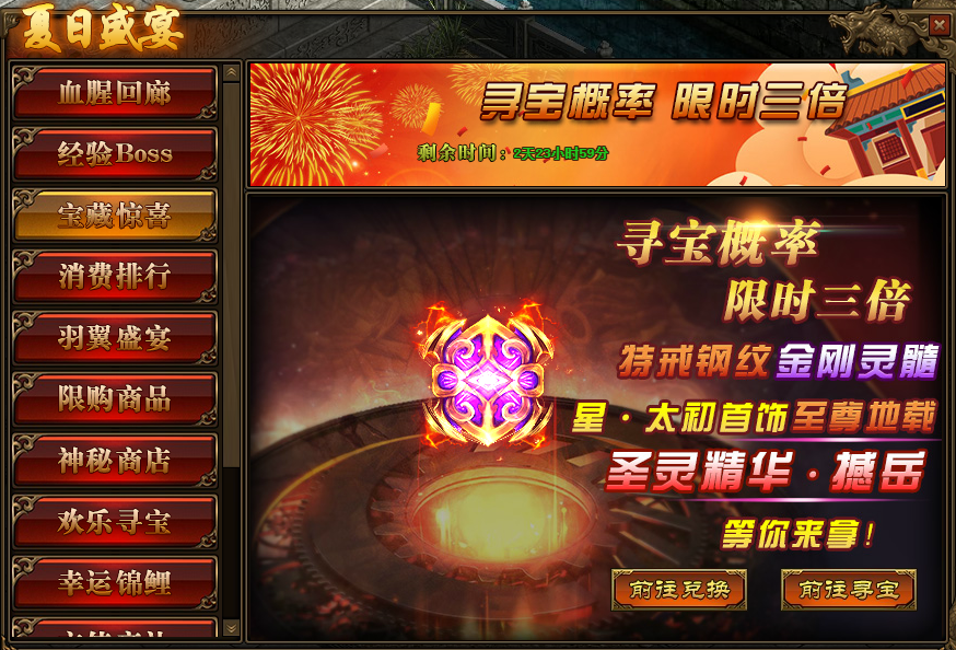 1.活动期间,玩家寻宝概率翻倍,极高几率获得星·太初首饰,传世灵器、传世灵甲,特戒钢纹,仙元石、碧落星空,传世灵器、传世灵甲,金刚灵髓、金刚精华,至尊风扬阵法以及圣灵精华(撼岳)