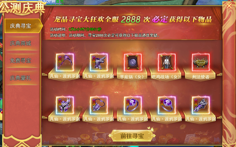 活动说明:龙晶寻宝大狂欢,全服2888次必得获得以下物品。