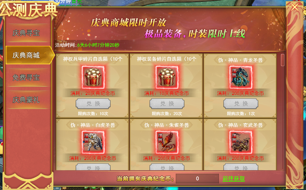 活动说明:庆典商城限时开放,极品装备时装限时上线。