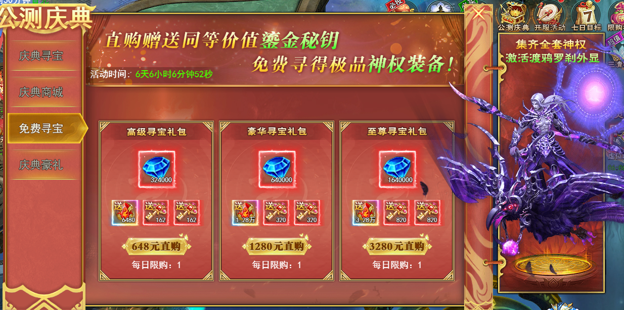 活动说明:活动期间,直购赠送同等价值鎏金秘钥,免费寻得极品神权装备。