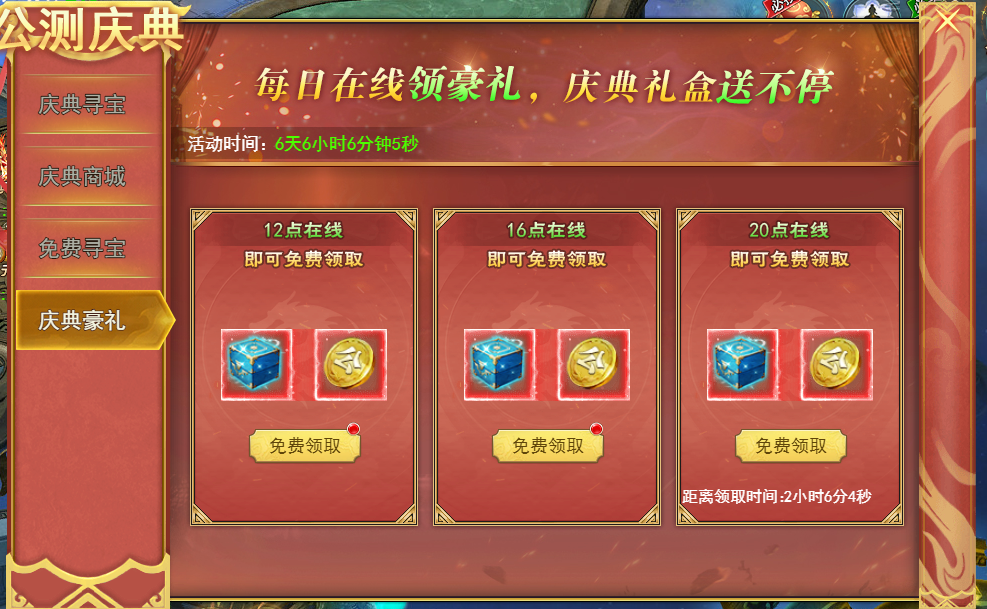活动说明:每日在线领豪礼,庆典礼盒送不停。
