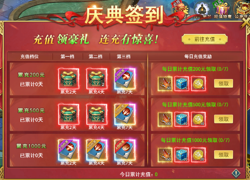 活动说明:活动期间,充值达标即可领取豪礼,连充达标更可领取极品技能书。