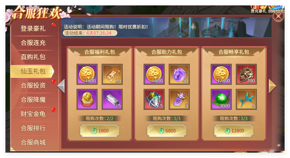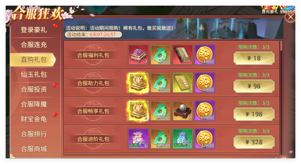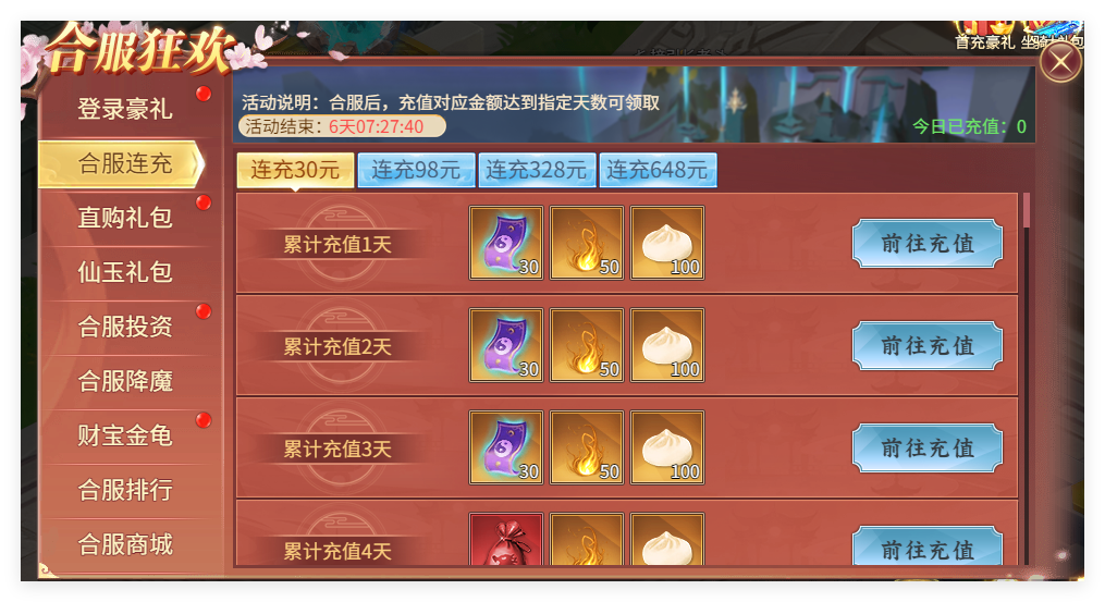 活动规则:七日之内,根据充值金额可领取对应连充奖励