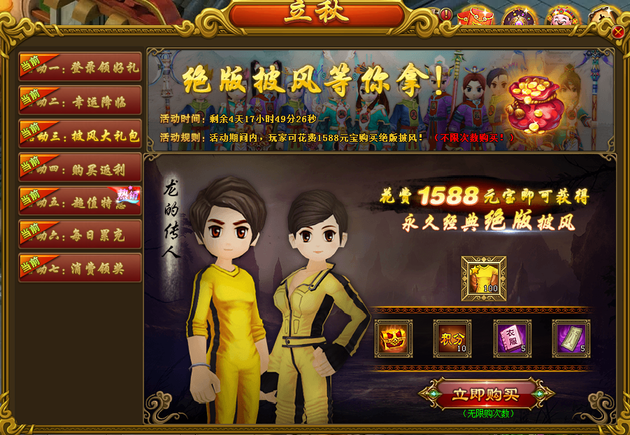 活动规则:活动期间内,花费元宝可购买绝版披风礼包。
