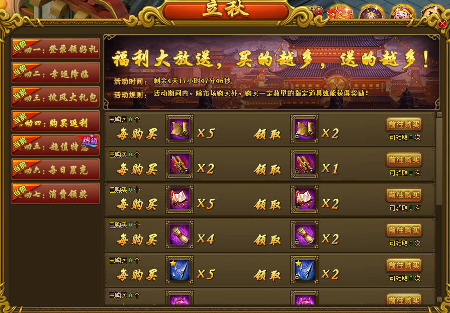 活动规则:活动期间内,除市场购买外,购买一定数量的指定道具可以获得奖励。