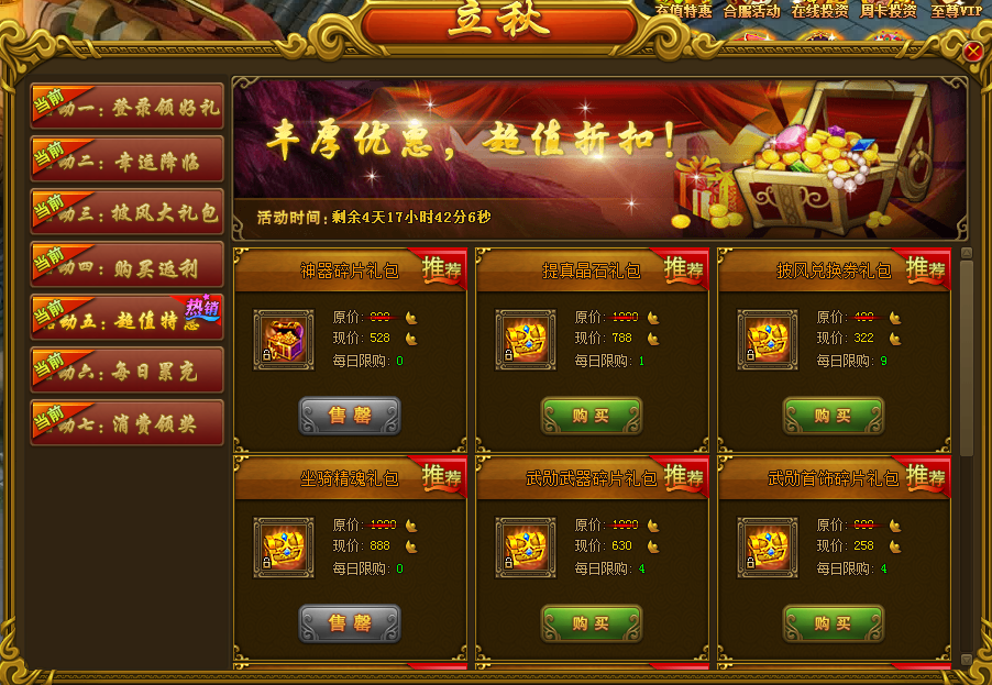 5. 每日累计充值5000元宝可获得:新卷轴自选礼包*10、激战江湖包大*5、(提真晶石,宝甲精魂,坐骑精魂)三选一*1、披风兑换券*100、补签令*1;
