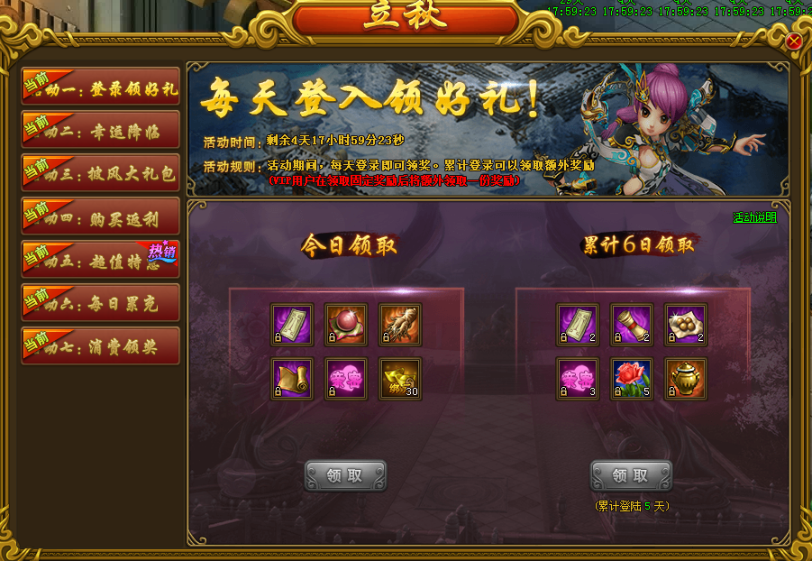 5. 第五天登录即可领取:50绑元、副本卷轴*3、至尊九转丹*1、至尊千年雪参*1、4千历练值*1、1千亲密度卷轴*1;